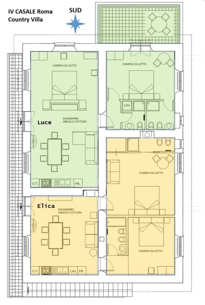 Gli appartamenti sono al primo piano a cui si arriva con una rampa di scale che parte dal giardino e che porta ad un ballatoio su cui sono i due ingressi di Elica e Luce.